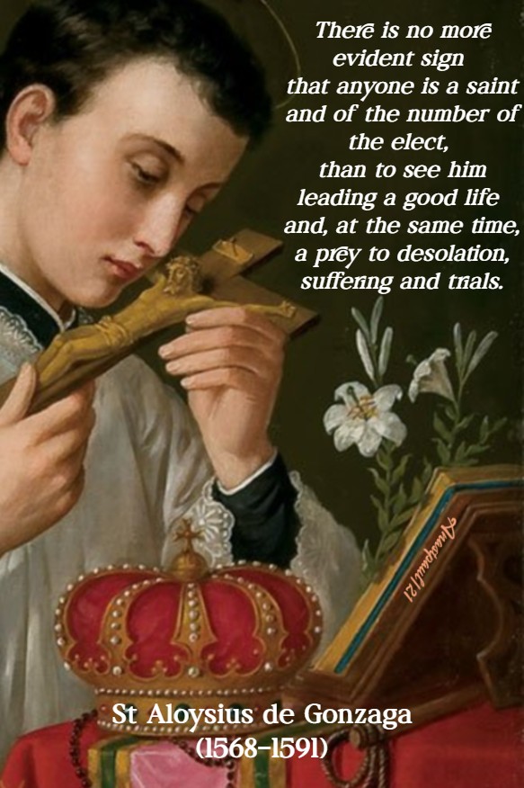 Aloysius, the eldest son of Ferdinand I Gonzaga, Marquis of Castiglione, was born on March 9, 1568. The first words he pronounced were the holy names of Jesus and Mary. When he was nine years of age he made a vow of perpetual virginity, and by a special grace was ever exempted from temptations against purity. He received his First Communion at the hands of Saint Charles Borromeo. At an early age he resolved to leave the world, and in a vision was directed by our Blessed Lady to join the Society of Jesus. The Saint’s mother rejoiced on learning his determination to become a religious, but his father for three years refused his consent. At length Saint Aloysius obtained permission to enter the novitiate on November 25, 1585. He took his vows after two years, and went through the ordinary course of philosophy and theology. He was wont to say he doubted whether without penance Grace would continue to make headway against nature, which, when not afflicted and chastised, tends gradually to relapse into its old state, losing the habit of suffering acquired by the labour of years. “I am a crooked piece of iron,” he said, “and am come into religion to be made straight by the hammer of mortification and penance.” During his last year of theology a malignant fever broke out in Rome; the Saint offered himself for the service of the sick, and he was accepted for the dangerous duty. Several of the brothers caught the fever, and Aloysius was of the number. He was brought to the point of death, but recovered, only to fall, however, into slow fever, which carried him off after three months. We are going!”—to which a fellow Jesuit remarked, “He talks of going to Heaven as we talk of going to Frascati!” In 1591, Aloysius died at the age of twenty-three, holding a crucifix. He died, repeating the Holy Name, a little after midnight of June 21, 1591.