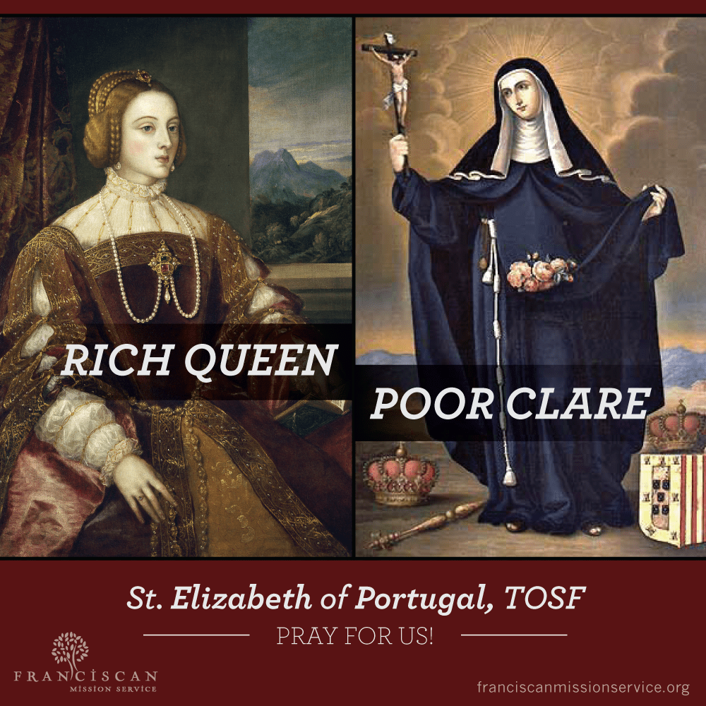 Denis, too, was the object of many of her peace endeavours. Elizabeth long sought peace for him with God, and was finally rewarded when he gave up his life of sin. She repeatedly sought and effected peace between the king and their rebellious son Alfonso, who thought that he was passed over to favour the king’s illegitimate children. She acted as peacemaker in the struggle between Ferdinand, king of Aragon, and his cousin James, who claimed the crown. And finally from Coimbra, where she had retired as a Franciscan tertiary to the monastery of the Poor Clares after the death of her husband, Elizabeth set out and was able to bring about a lasting peace between her son Alfonso, now king of Portugal, and his son-in-law, the king of Castile.
