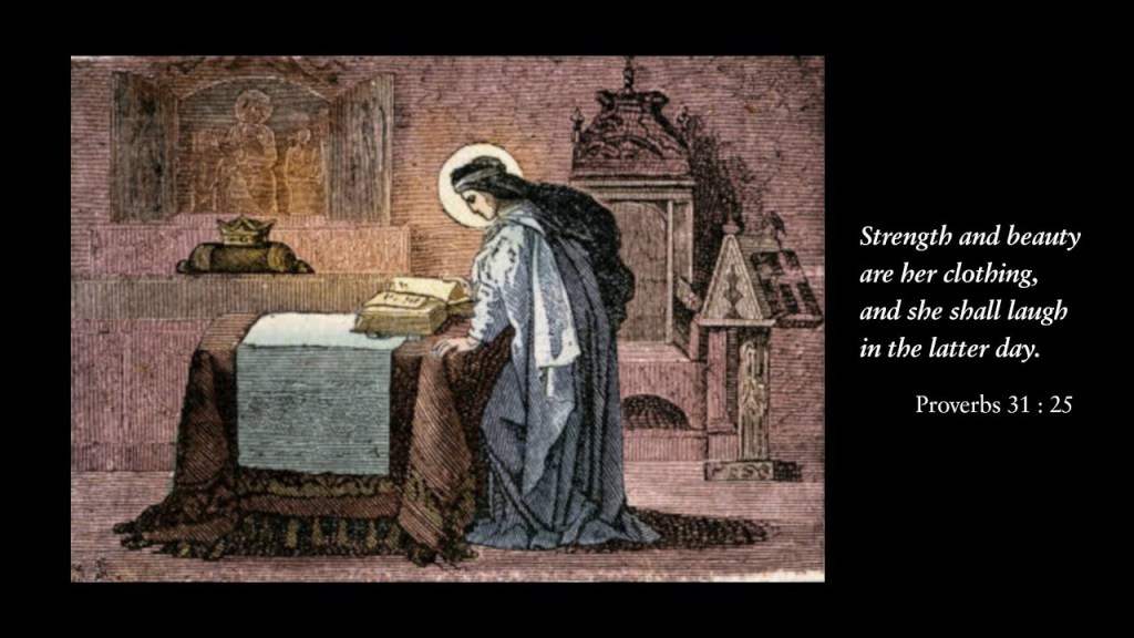 Who shall find a valiant woman? She who can draw from stores of never-failing courage the necessary energy to make head against all the difficulties of her position, its daily worries, hourly anxieties, and ever recurring contradictions and disappointments. She who can bear up briefly under the many inevitable shocks of life; under family jars, interior depression, and all of those slights and wounds, which, like the legions of insects in autumn, perpetually assaiing the heart of a woman. She presides with unvarying prudence over the labours of her household and all of the details of housekeeping; who rules her servants wisely and preserves due order in the arrangement of that multitude of petty affairs which follow on one another through every hour of the day, as quickly as the clouds of Heaven flit across the sky. Who shall find a valiant woman, who shows herself superior to disaster, to calumny, to the malice of men, and to the many blows of fate; and who, when the violence of the waves is spent, still remains firmly rooted in the sea, a beacon of light to poor shipwrecked mariners.