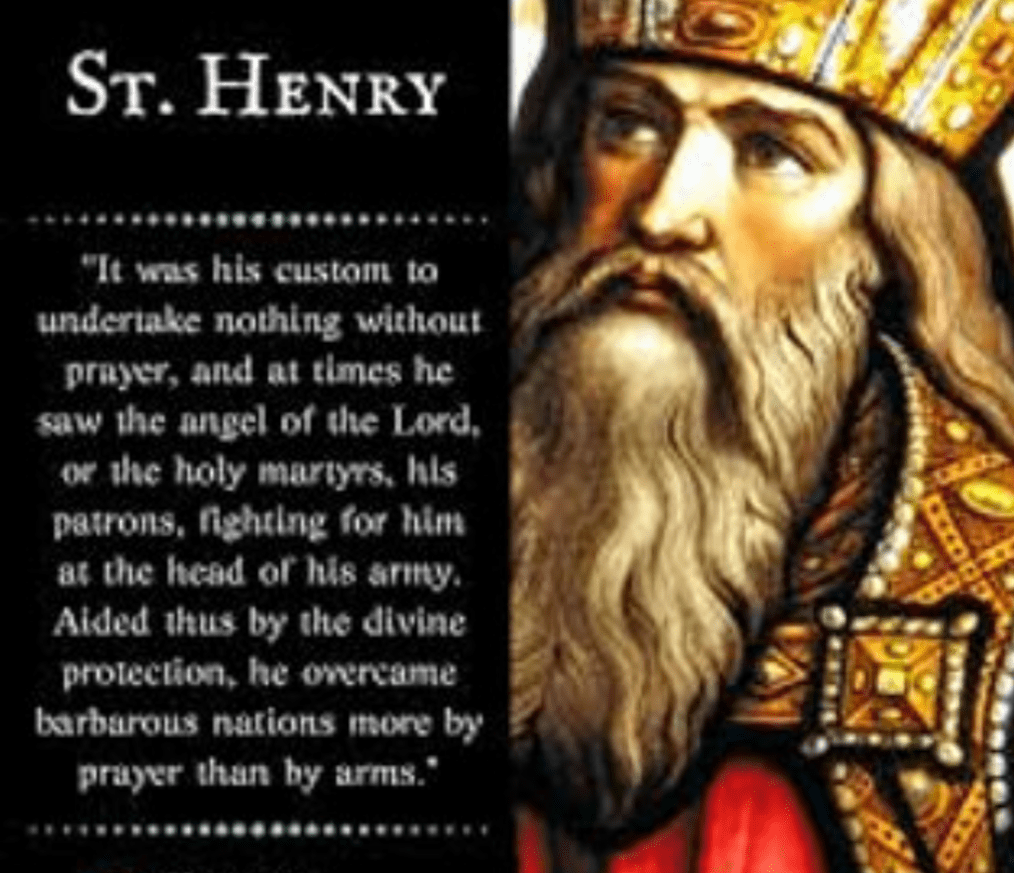 Born in Bavaria, the son of Duke Henry II and Princess Gisela of Burgundy, Saint Henry fought wars on all sides, including famously attacking the Christian Poles in alliance with the pagan Baltic tribes. Yet, after Pope Benedict VIII crowned him as Holy Roman Emperor in 1014, Henry displayed undisputed piety. Together with his wife, Saint Cunegunda, they assisted the poor. As Emperor he was instrumental in fostering ecclesiastical and Monastic reform. He founded the See of Bamberg as a centre for missionary activity to the Slavs. He was openhanded to the poor and a strong supporter of monasteries. On his way home from battles, he would visit pilgrimage sites. Thus it was that, returning home from an attack on the Greeks, he fell gravely ill at Saint Benedict’s monastery at Monte Cassino in 1021. It is said that he was cured by the intercession of Benedict himself. By agreement with his spouse, he preserved virginity in the marriage. After his death in 1024, Henry was canonized by Pope Eugene III in 1146 and declared patron of Benedictine oblates.