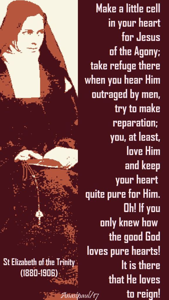 Saint Elizabeth of the Trinity († 1906) was a French Carmelite nun whose writings focused on the indwelling of the Trinity. She died from Addison’s disease at the age of twenty-six. [From I Have Found God: Complete Works, Volume I, General Introduction: Major Spiritual Writings, Sister Aletheia Kane, o.c.d., Tr.
