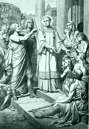 Since the Fourth Century, Saint Lawrence has been one of the most honoured martyrs of the Roman Church. Constantine the Great was the first to erect a little oratory over his burial place, which was enlarged and beautified by Pope Pelagius II [579–590]. Pope Sixtus III [432–440] build in large basilica with three naves, the apse leaning against the older church, on the summit of the hill where he was buried. In the thirteenth century, Honorius III made the two buildings into one, and so the Basilica of San Lorenzo remains to this day. Pope Saint Damasus [366–380] wrote a panegyric in verse, which was engraved in marble and placed over his tomb. Two contemporaries of the last-named pope, Saint Ambrose of Milan and the poet Prudentius, give particular details about Saint Lawrence’s death. Ambrose relates that when St. Lawrence was asked for the treasures of the Church he brought forward the poor, among whom he had divided the treasure, in place of alms; also that when Pope Sixtus II was lead away to his death he comforted Lawrence, who wished to share his martyrdom, by saying that he would follow him in three days. The saintly bishop of Milan also states that St. Lawrence was burned to death on a gridiron. In like manner, but with more poetical detail, Prudentius describes the martyrdom of the Roman deacon in his hymn on Saint Lawrence.