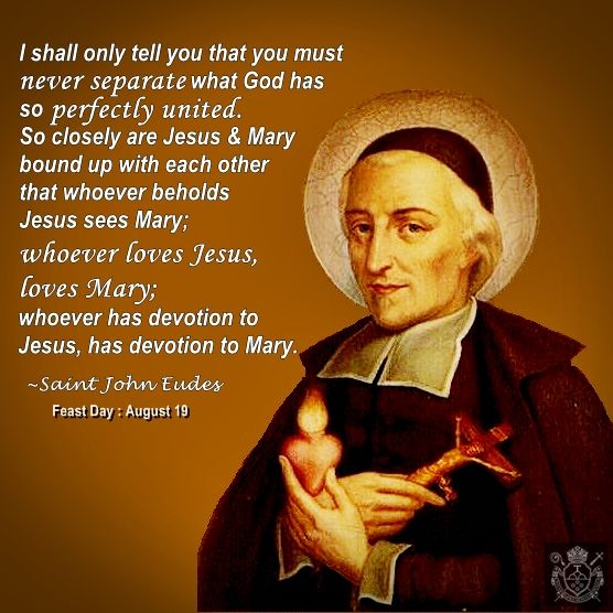 John was born in Ri, France, November 14, 1601. His parents, who had been praying for an end to their infertility, offered him to God through Mary before he was born. John became a priest of the Oratory and preached numerous missions in country parishes. In 1641, founded the Congregation of Our Lady of Refuge [Good Shepherd Nuns]. In 1643 he founded the Society of Jesus and Mary (the Eudists) to provide much-needed seminary education and for missionary work. John promoted the tender love of Jesus and His Mother in response to the severe judgements of 17th-century Jansenism. Pope Leo XIII declared him the “father, doctor, and apostle of the liturgical cult of the Sacred Hearts of Jesus and Mary”. Hewrote a number of ascetical books; died at Cren, August 19, 1680.