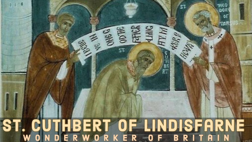 Saint Cuthbert (634 – 687) was thought by some to be Irish and by others, a Scot. Bede, the noted historian, says he was a Briton. Orphaned when a young child, he was a shepherd for a time, possibly fought against the Mercians, and became a monk at Melrose Abbey.