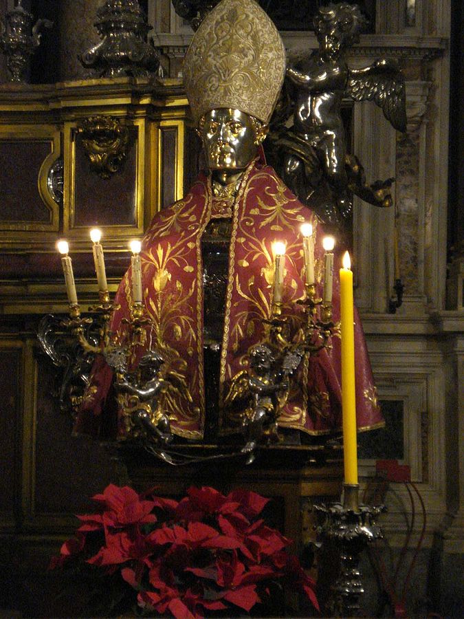In the great church at Naples are preserved some of the blood of St. Januarius in two glass phials, and also his head. The blood is congealed, but every year up to the present it liquefies when placed near the martyr’s head. This miracle has been verified both by scientists, and by many pious and learned persons. Cardinal Schuster, Archbishop of Milan, was able to observe it closely and, like others who have studied it, was obliged to confess that there seems to be no possible natural explanation of this event. It may be that in this manner, God is pleased to show to the people of Naples that the blood of their great Patron is still active and powerful, in the sight of the LORD, for with God there is no past, but all is present and living in His sight. He is remembered in New York City at the yearly festival of San Gennaro. Januarius is the patron saint of the City of Naples.