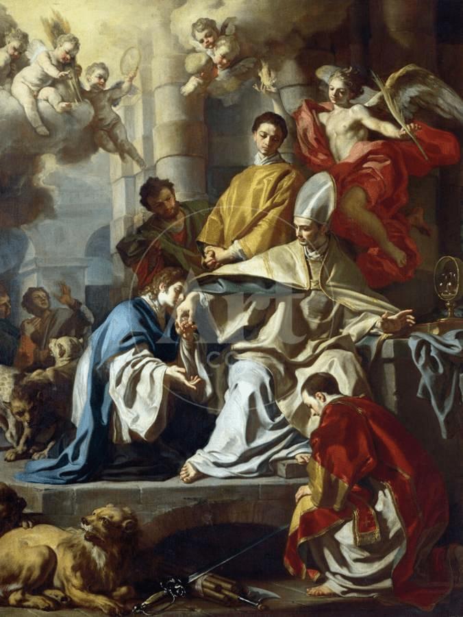 St. Januarius, Bishop of Beneventum, received word that two deacons and two laymen were imprisoned under the brutal emperor Diocletian. Januarius was preparing to visit the men in prison when the Romans arrested him and his companions on their way to perform this work of mercy. The imprisoned men, including Januarius and his companions, Acutius, Eutychius, Desiderius, Festus, Proculus, and Socius, were all sentenced to death and exposed to wild beasts at Puteoli. When the beasts refused to attack them, the men were beheaded in 305.