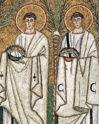 These holy martyrs, scourged and beheaded, during the persecution of the third century, were commemorated by Pope Damasus with the following inscription: “The Kingdom of Heaven holds thee, O Protus, and thither dost thou follow him, O valiant Hyacinth, robed in the purple of thy blood. They were brothers and were unconquered in spirit. Protus first won the crown, but Hyacinth equally deserved the palm.“